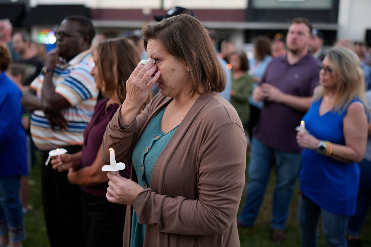 Nioka Curtis wipes away tears during a candlelight vigil honoring the victims of a blast at an explosives plant, Accurate Energetic Systems, Sunday, Oct. 12, 2025, in Waverly, Tenn. (AP Photo/George Walker IV)