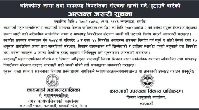 १४ कात्तिक, काठमाडौं । काठमाडौं महानगरपालिका र काठमाडौं उपत्यका विकास प्राधिकरणले सात दिनभित्र अतिक्रमिक जग्गा तथा मापदण्ड विपरीतका संरचना हटाउन निर्देशन दिएका छन् । महानगरपालिका र उपत्यका विकास प्राधिकरणको गत असोज २ गते बसेको संयुक्त बैठकको निर्णय अनुसार आज सार्वजनिक सूचना जारी गरी अतिक्रमित क्षेत्र खाली गराउन निर्देशन दिइएको हो ।