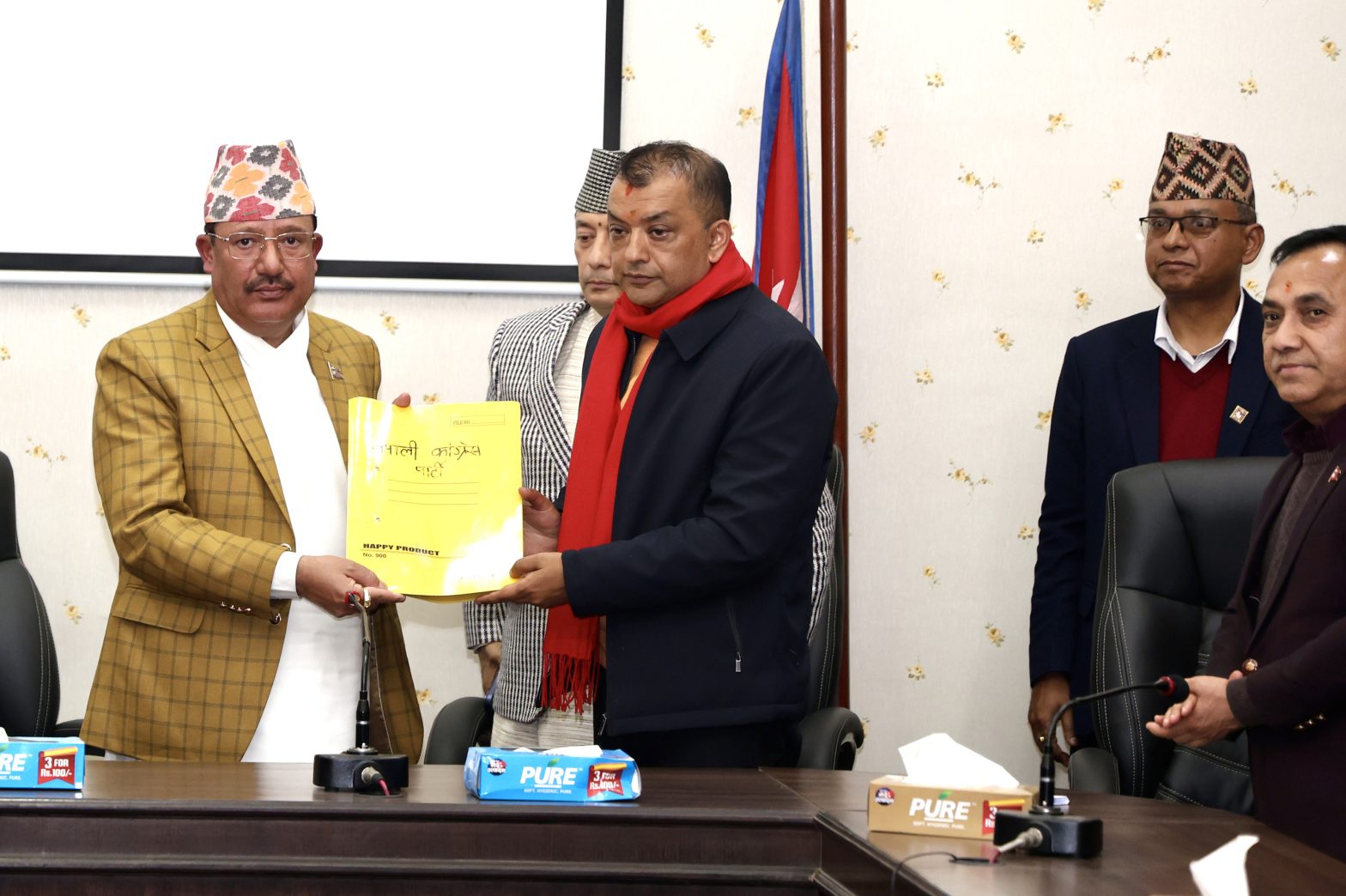 नेपाली कांग्रेसको विशेष महाधिवेशन पक्षधरको आव्हानमा भएको विशेष महाधिवेशनपछि नवनिर्वाचित सभापति गगनकुमार थापा नेतृत्वको टोली बिहीबार निर्वाचन आयोगका कार्यवाहक प्रमुख निर्वाचन आयुक्त रामप्रसाद भण्डारीलाई आयोगको कार्यालयमा पार्टीको विवरण अद्यावधिक गर्ने प्रयोजनका लागि दस्तावेज हस्तान्तरण गर्नुहुँदै । तस्बिरः प्रदीपराज वन्त/रासस