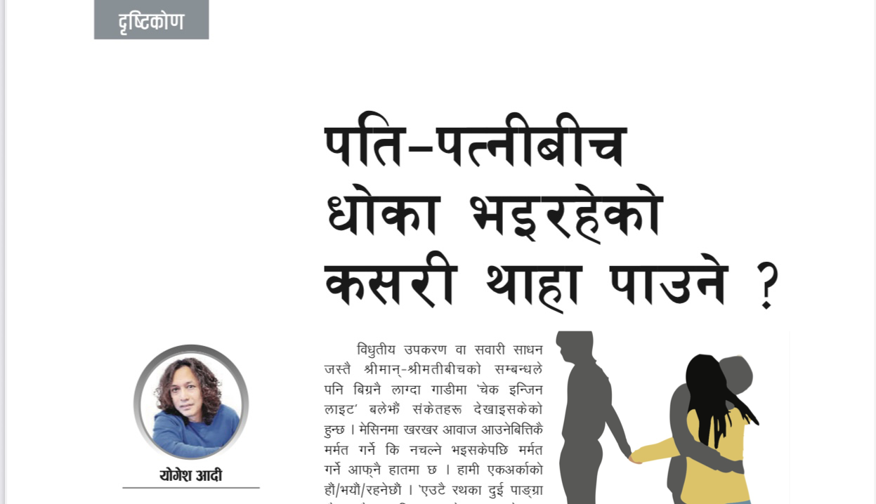 ३, तँपाई बिदेशमा हुनुहुन्छ तर श्रीमती भने नेपालमा छिन भने अझ सचेत रहनुपर्छ । घरमा भन्दा प्राय बाहिर रहने । सगोलमा बस्दा असुबिधा भएको, झगडा परिराख्ने भनेर छुट्टै बस्न जिद्दी गर्न थालिन् र हिसाबकिताव गोलमाल देखाउन थालिन भने जासुस् गर्न थाल्नुस् ।