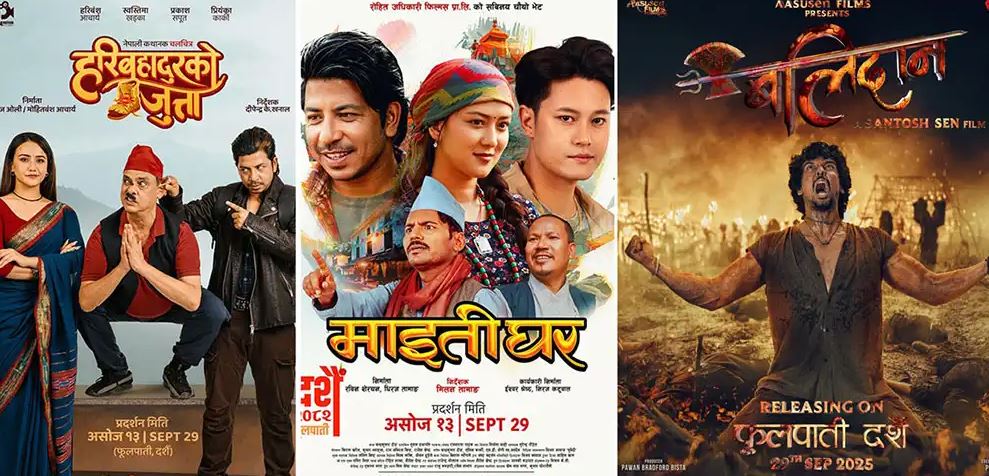 १५ असोज, काठमाडौं । दसैँका अवसर पारेर तीन नेपाली चलचित्र प्रदर्शन भएका छन् । फूलपाती अर्थात् असोज १३ गतेदेखि चलचित्र ‘हरिबहादुरको जुत्ता’, ‘माइतीघर’ र ‘बलिदान’ नेपालभर प्रदर्शनमा आएका छन् । दसैँको बिदा भए पनि तीन वटै चलचित्रले घरेलु बजारमा अपेक्षाकृत व्यापार भने गर्न सकेका छैनन् । चलचित्र विकास बोर्डको ‘बक्सअफिस २ सिनेमा’ एपमा चलचित्र ‘बलिदान’ ले दुई दिनमा रु एक करोड पाँच लाख ६५ हजार व्यापार (ग्रस कलेक्सन) गरेको तथ्याङ्क छ ।