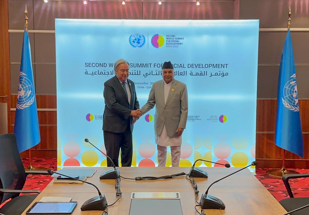 काठमाडौँ, १९ कात्तिकः ‘सामाजिक विकासका लागि दोस्रो विश्व शिखर सम्मेलन’मा सहभागी हुने सिलसिलामा कतारको राजधानी दोहामा रहेका राष्ट्रपति रामचन्द्र पौडेलसँग संयुक्त राष्ट्रसङ्घका महासचिव एन्टोनियो गुटेरेसले आज शिष्टाचार भेट गरेका छन् । त्यस अवसरमा उनीहरुबीच कोपनहेगन प्रतिबद्धताको कार्यान्वयन, सामाजिक विकास, शान्ति, सामाजिक न्याय र दिगो विकासका साझा लक्ष्य प्राप्तिबारे विचारविमर्श भएको राष्ट्रपतिका सञ्चारविज्ञ किरण पोखरेलले राससलाई बताए ।