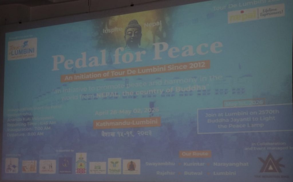 १० वैशाख, काठमाडौं । नेपालमा शान्तिको सन्देश फैलाउने उद्देश्यसहित ‘टुर डे लुम्बिनी ‘पेडल फर पीस २०२६’ आयोजना हुने भएको छ । टुर दी लुम्बिनीका संस्थापक मेघ आलेका अनुसार यही वैशाख १५ देखि १९ गतेसम्म काठमाडौंबाट लुम्बिनीसम्म साइकल यात्रा हुने भएको हो । साइकल यात्रामा नेपाल तथा विदेशका साइकल यात्री, युवा, कर्पोरेट क्षेत्रका प्रतिनिधि तथा सञ्चारकर्मीहरूको… Continue reading वैशाख १५ देखि काठमाडौंबाट लुम्बिनीसम्म ‘शान्तिका लागि साइकल यात्रा’ हुने