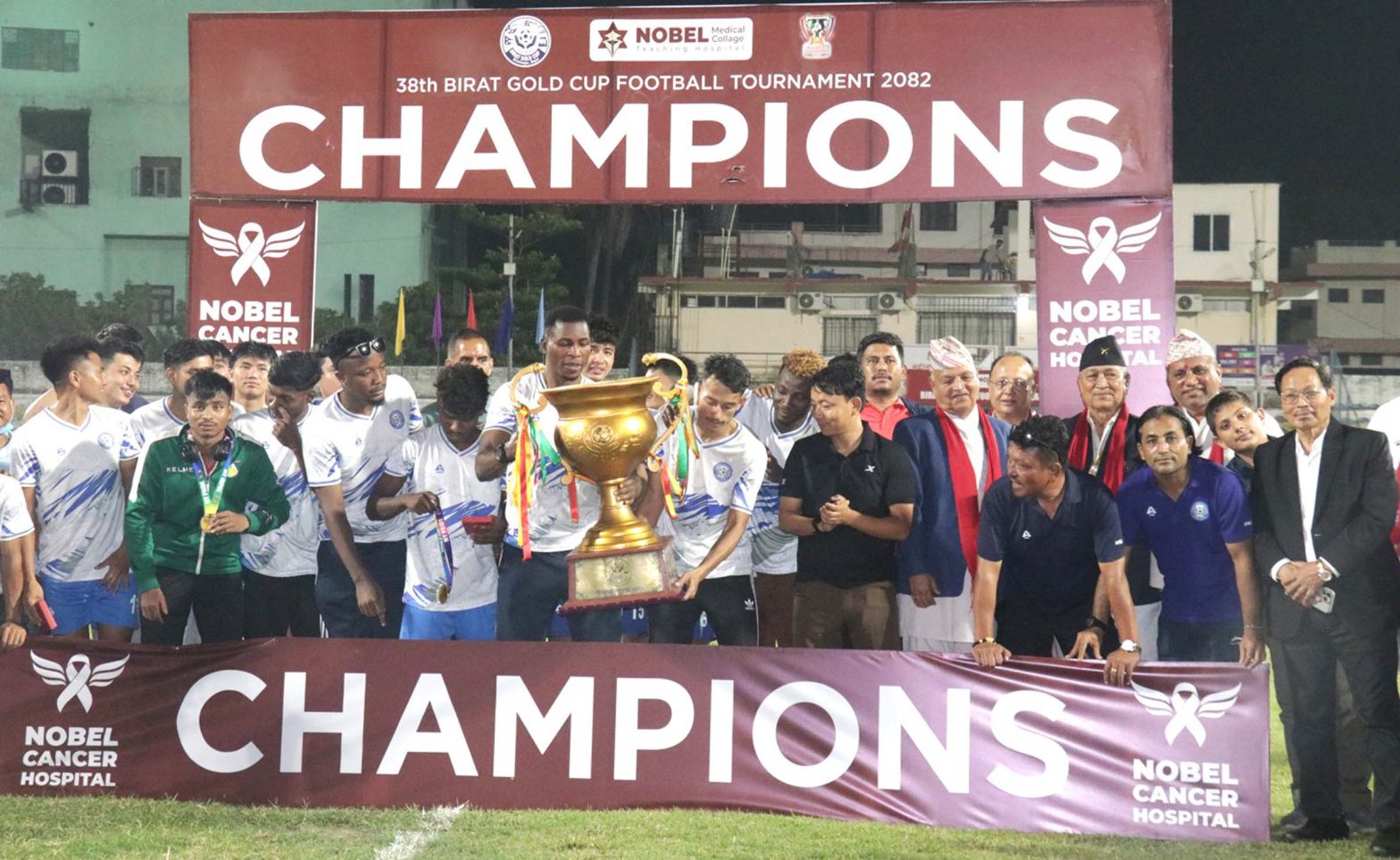 मोरङ, ६ वैशाख । विराट गोल्डकप फुटबल प्रतियोगिताको ३८औँ संस्करणको उपाधि झापा–११ ले जितेको छ । आज भएको फाइनलमा सम्राट स्पोर्टिङ क्लब विराटनगरलाई २–१ गोलको अन्तरले पराजित गरी झापाले उपाधि हात पारेको हो । उपाधिसँगै झापाले ११ लाख रूपैयाँ नगद र ट्रफी प्राप्त गरेको छ भने उपविजेता सम्राट स्पोर्टिङले पाँच लाख रूपैयाँ प्राप्त गरेको छ… Continue reading विराट गोल्डकपको उपाधि झापा–११ लाई